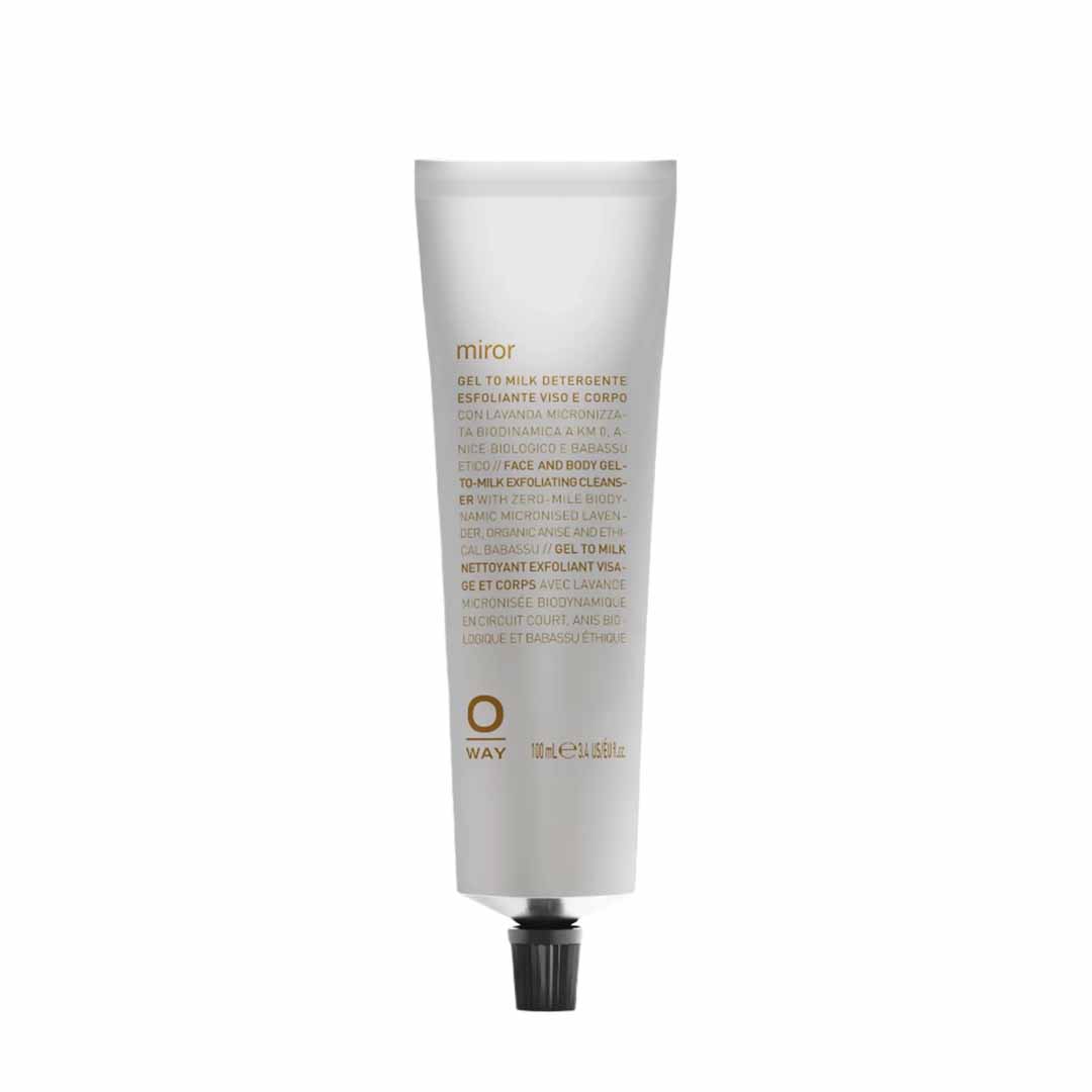 OWAY – Mirror er et eksfolierende renseprodukt med en transformerende tekstur, fra gel til en fløjlsblød mælk, når den kommer i kontakt med vand. Den efterlader ansigts- og kropshuden blød og glat.